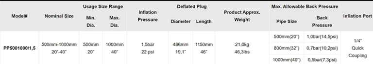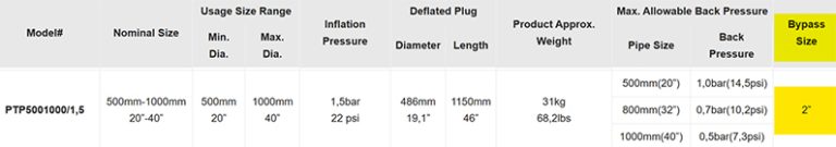 Ejemplo: PP5001000 → Para tuberías de 500–1000 mm, sin conexión de bypass.